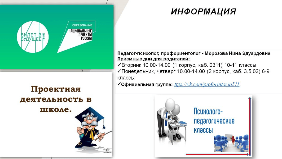Я, Морозова Нина Эдуардовна, педагог-навигатор школы Всероссийского проекта «Билет в будущее», реализуемого в рамках Федерального проекта «Успех каждого ребёнка», и я, представляю Северо-Западный регион город Санкт-Петербург, школу № 511 Пушкинского района. наше образовательное учреждение реализует все три уровня профминимума и является «опорной» школой города Санкт-Петербурга. История взаимодействия с проектом началась в сентября 2022 года и имела стремительное погружение в профориентационной процесс.